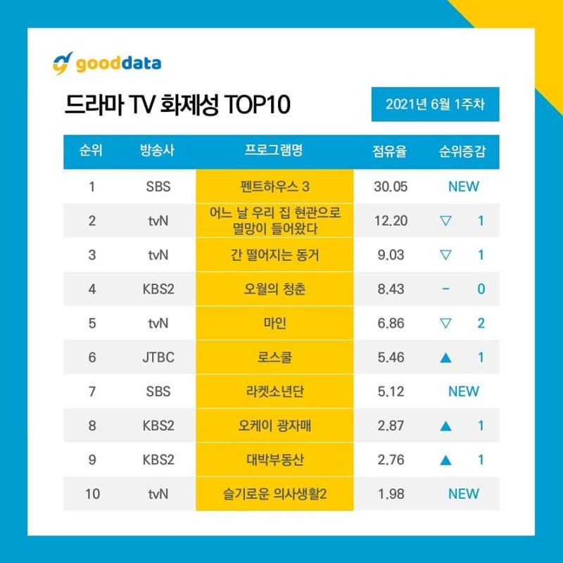 10 อันดับละครเกาหลีที่ได้รับความนิยมมากที่สุดในสัปดาห์แรกของเดือนมิถุนายน มีดังนี้: