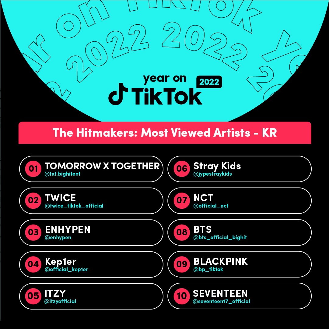 เมื่อวันที่ 7 ธันวาคม ตามเวลาเกาหลี แพลตฟอร์มโซเชียลมีเดียได้สรุป “ปีที่ผ่านมาบน TikTok” ด้วยรายชื่อ 10 อันดับแรกของศิลปินที่มีผู้ชมมากที่สุดของเกาหลี แทร็กยอดนิยม และศิลปินที่ได้รับผู้ติดตามใหม่มากที่สุดในปี 2022
